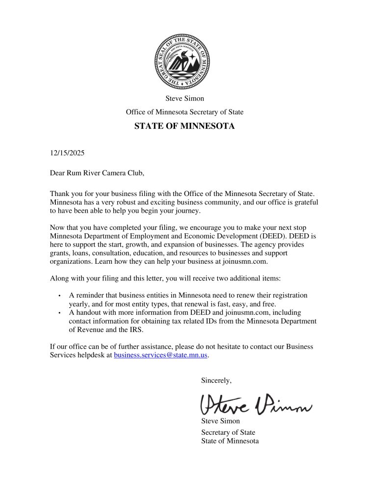 Filing acceptance from the State of Minnesota Original filing for Rum River Camera Club to the state of Minnesota to become an official non profit organization.